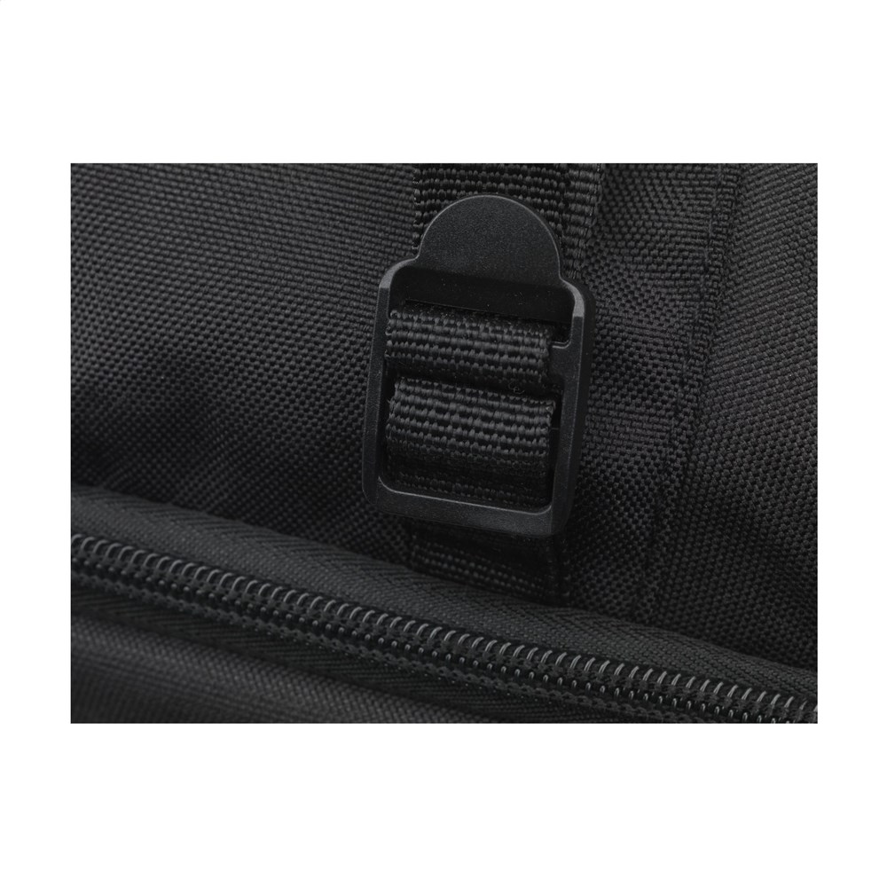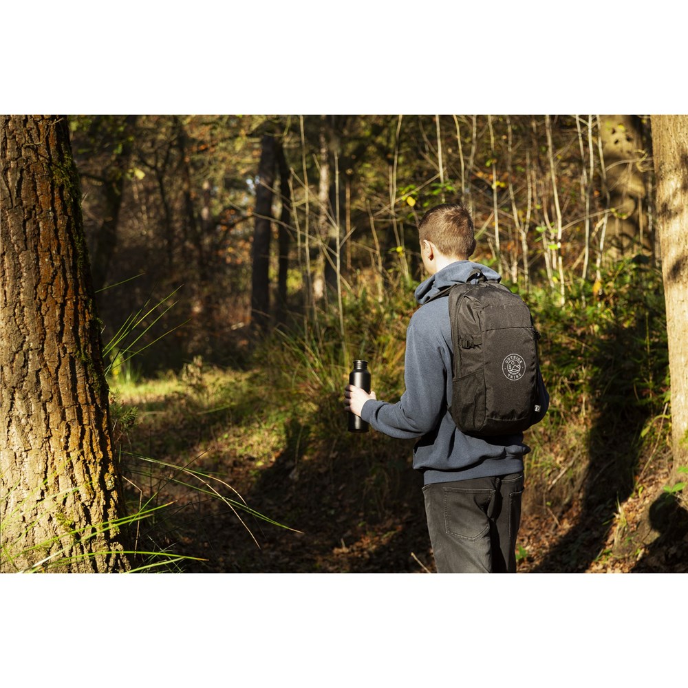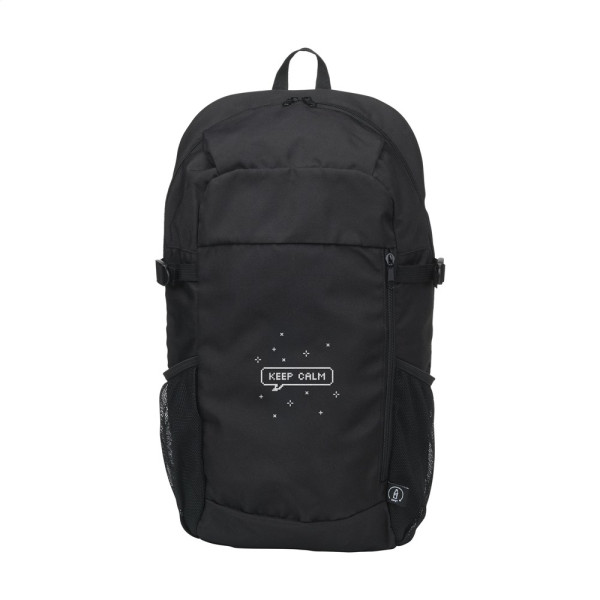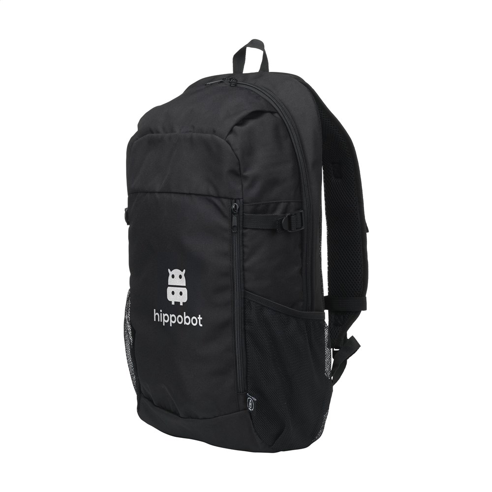 Rugzak van stevig RPET polyester. Een smal model met een royaal compartiment met ruimte voor het veilig vervoeren van een laptop tot 15,6 inch. Met extra ritsvak aan de voorzijde en een meshvak aan beide zijdes. De verstelbare schouderriemen en het achterpaneel zijn bekleed met mesh stof en voorzien van foam voor extra draagcomfort. De verstelbare schouderriemen hebben extra lussen en een band om de riemen op hun plaats te houden tijdens het dragen. Met stevige ritsen, volledig gevoerd en keurig afgewerkt. Een compacte rugzak met verrassend veel ruimte. GRS-gecertificeerd. Totaal gerecycled materiaal: 92%. Inhoud ca. 12 liter.