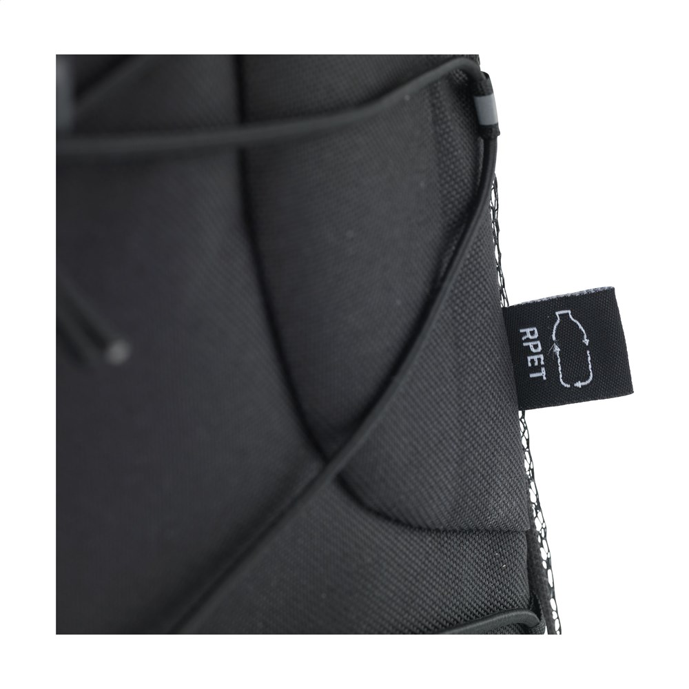 Rugzak van stevig 600D RPET met 2 ritsvakken. Het royale hoofdcompartiment is voorzien van foam beschermvakken, waarvan er een geschikt is voor een laptop tot 15,6 inch. Het andere vak is ideaal voor het bewaren van kleinere accessoires, documenten of een notitieboek. Aan de zijkant van de tas vind je een meshvak voor het vervoeren van een drinkfles en aan de voorzijde van de tas zit een handige elastiek, gemakkelijk voor het vervoeren van een bijvoorbeeld een jas of trui. De draaglus, verstelbare schouderriemen en de rugzijde zijn voorzien van foam voor extra draagcomfort. Geheel gevoerd. De rugzak is aan de voorzijde afgewerkt met fluoriserende accenten, zodat je ook zichtbaar bent in het donker. GRS-gecertificeerd. Totaal gerecycled materiaal: 97%. Inhoud ca. 20 liter.