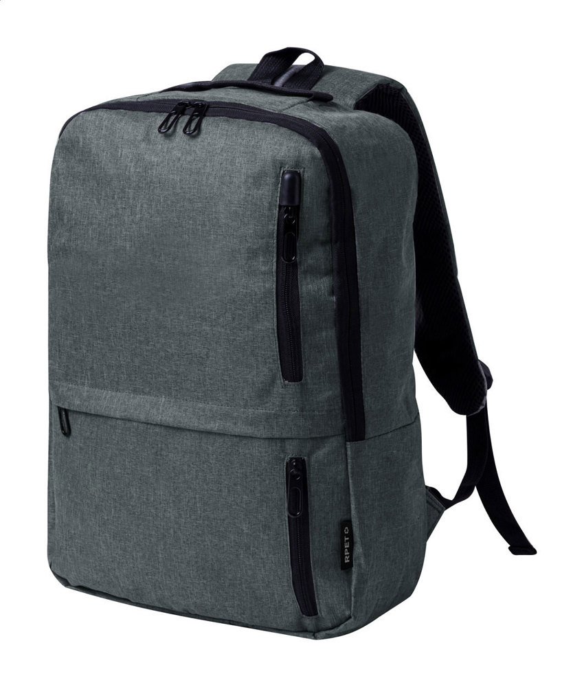 RPET-rugzak met compartimenten met ritssluiting, gewatteerd laptop- (15") en tablet (10") compartiment, gewatteerde rug- en schouderbanden. 600D RPET-polyester met onderscheidend RPET-label.