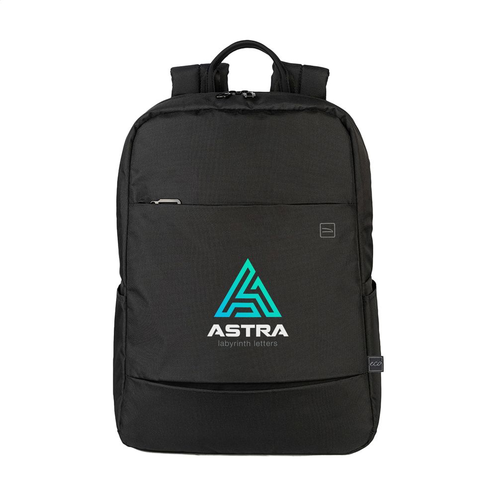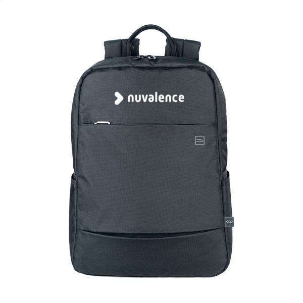 Lichtgewicht laptoprugzak van het Italiaanse merk Tucano. De moderne, compacte rugzak is gemaakt van materialen geproduceerd uit gerecycled kunststof, waaronder 12 gerecyclede PET-flessen. Het royale compartiment is voorzien van een mesh ritsvak en heeft een stootbestendig opbergvak voor laptops tot 15,6 inch of MacBook Pro 16 inch. Het ritsvak aan de voorzijde heeft een organiser voor pasjes, telefoon en pennen. Compleet gevoerd. De verstelbare, gewatteerde schouderbanden en de ergonomische rugzijde zorgen voor extra draagcomfort. Met handige trolleyriem en zijvakken voor een drinkfles en paraplu. Een handige en praktische rugzak voor zowel werk als vrije tijd. Inhoud ca. 20 liter.