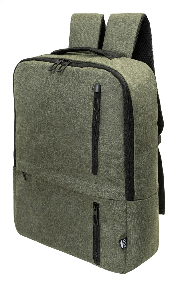 RPET rugzak met rits hoofdvak en 3 rits voorzakken. Met gewatteerde tablet (10") en laptopvakken (15"), gewatteerde rug - en schouderbanden. 600D RPET polyester, met onderscheidend RPET label.