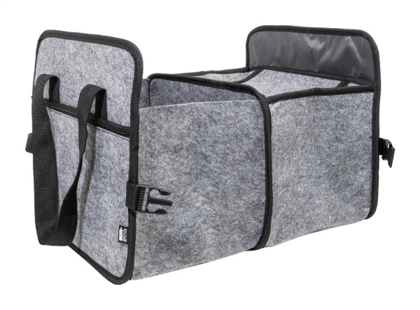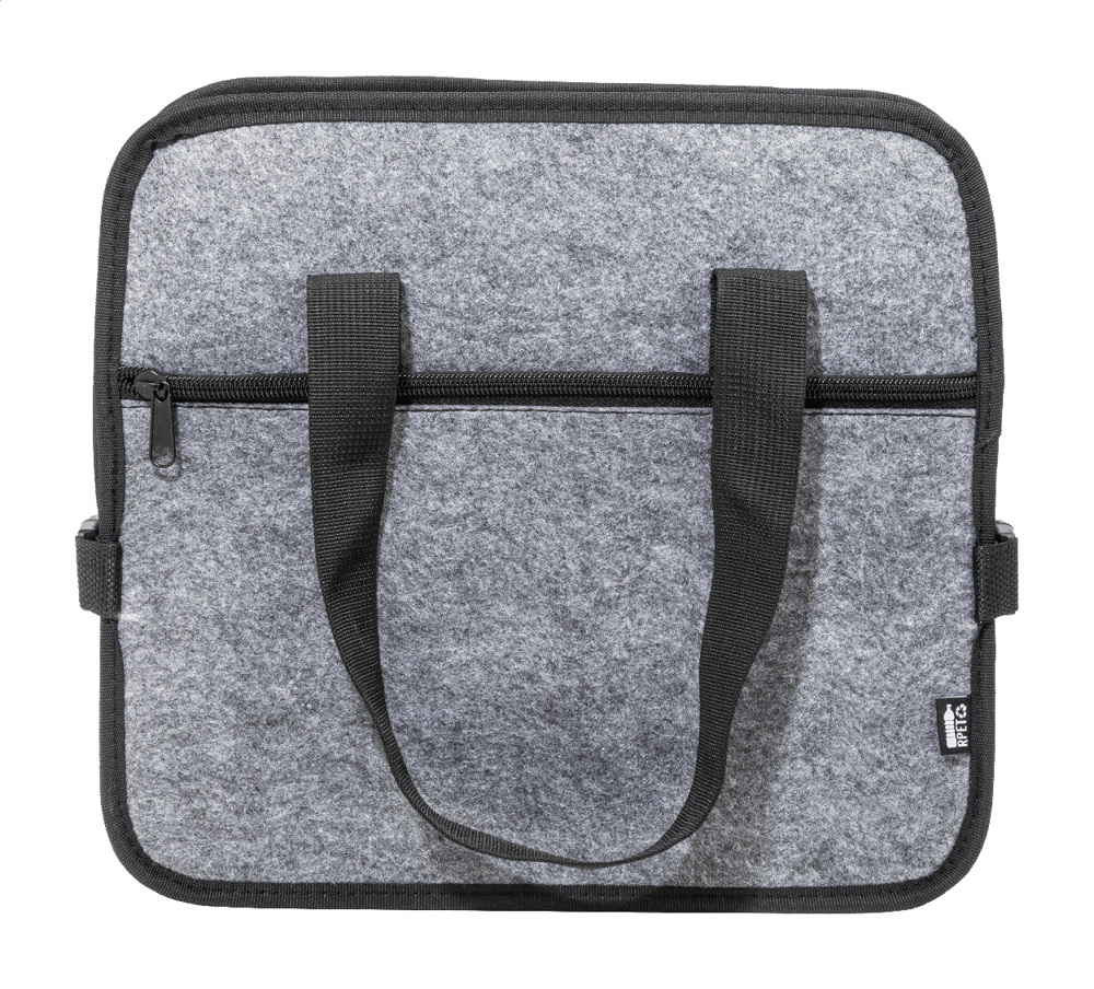 Opvouwbare, RPET vilten autolaarzenorganizer met ritssluiting aan de voorkant, lange handgrepen en zijgespen voor gemakkelijke opslag. Inclusief één open opbergvak en één koelcompartiment met ritssluiting en aluminium vulling. Met onderscheidend RPET-label.