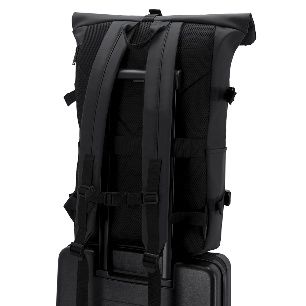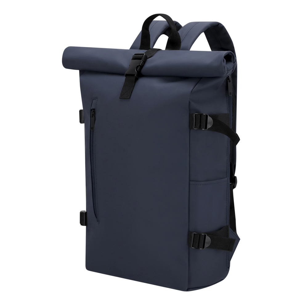 Rugzak van zacht PU met rolsluiting met rits en gesp. Voorzien van een voorvak en een achtervak met zij-ingang, beide met onzichtbare ritsen, en twee extra zijvakken. Ruim interieur met gevoerd vak voor laptops tot 15 inch. Verstelbare zijbanden maken het mogelijk het volume naar behoefte te verkleinen. PU schouderbanden en gewatteerde rug voor extra comfort. Borstriem met gesp voor een veilige pasvorm. Met achterband voor bevestiging aan trolley of koffer – ideaal voor reizen en woon-werkverkeer.