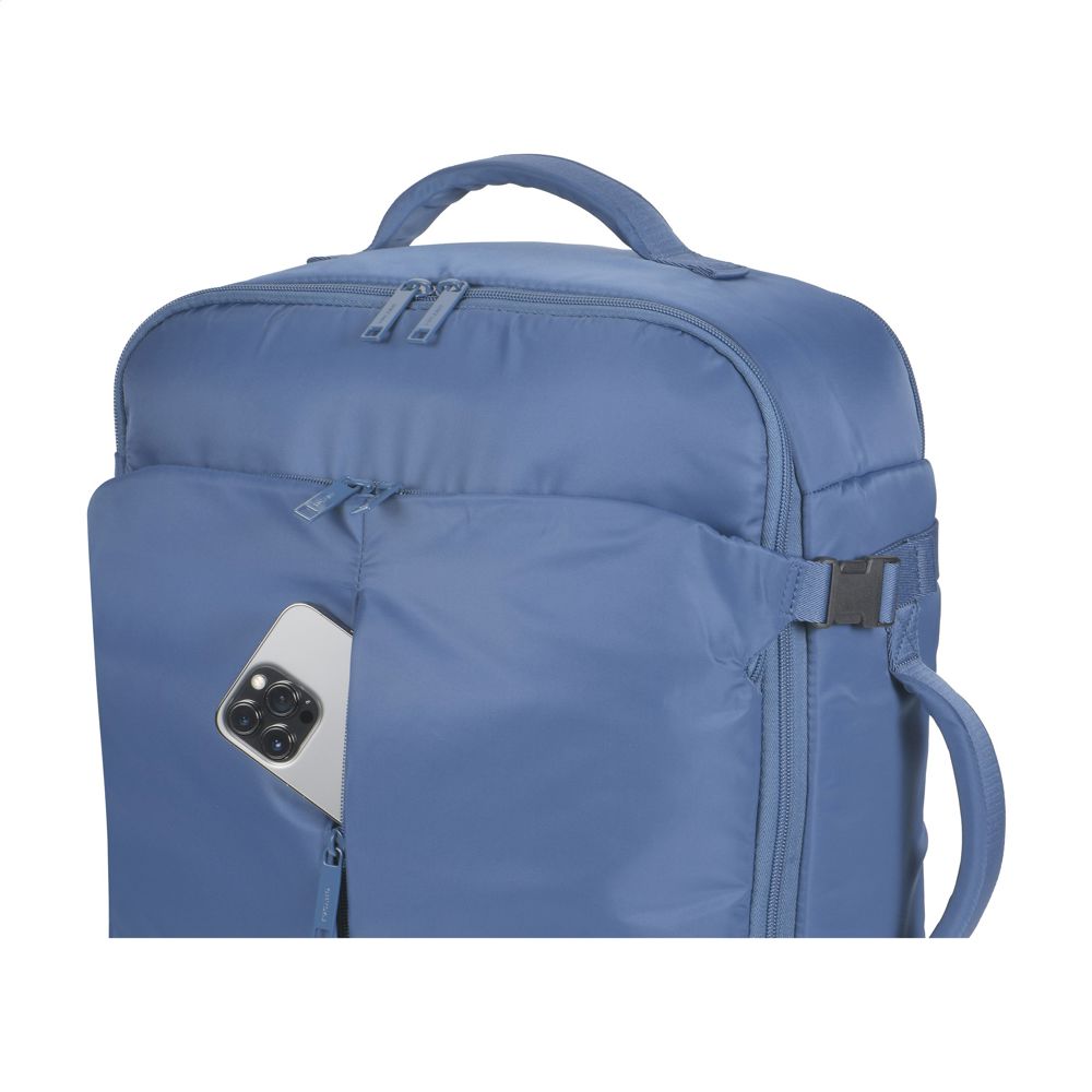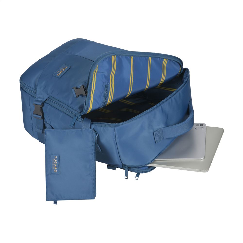 Handbagage rugzak van het Italiaanse merk Tucano. Deze compacte en reisvriendelijke cabin-rugzak voldoet aan de afmetingseisen van alle lowcost luchtvaartmaatschappijen. De nylon rugzak is gemaakt van materialen geproduceerd uit gerecycled kunststof, waaronder 24 gerecyclede PET-flessen. Het grote, ruime hoofdvak, gevoerd met een elegante gestreepte stof, biedt plaats aan kleding en benodigdheden. Aan de binnenzijde is een uitneembare paspoorthouder bevestigd en vind je een apart binnenvak voor een Airtag. Met een handige ritsvak aan de voorzijde voor accessoires. De rugzijde en verstelbare schouderbanden zijn gewatteerd en voorzien van een ademende meshstof voor optimaal draagcomfort. Met handige trolleyriem en extra gewatteerd achtervak met intern ritsvak voor het vervoeren van laptops tot 15,6 inch of MacBook Pro 16 inch. Geniet van perfecte draagbaarheid met twee handgrepen, één aan de bovenkant en één aan de zijkant. Deze rugzak is ontworpen om te voldoen aan de cabineafmetingen van alle luchtvaartmaatschappijen. Past onder de stoel in het vliegtuig en is daarmee de ideale reisgenoot tijdens vliegreizen.