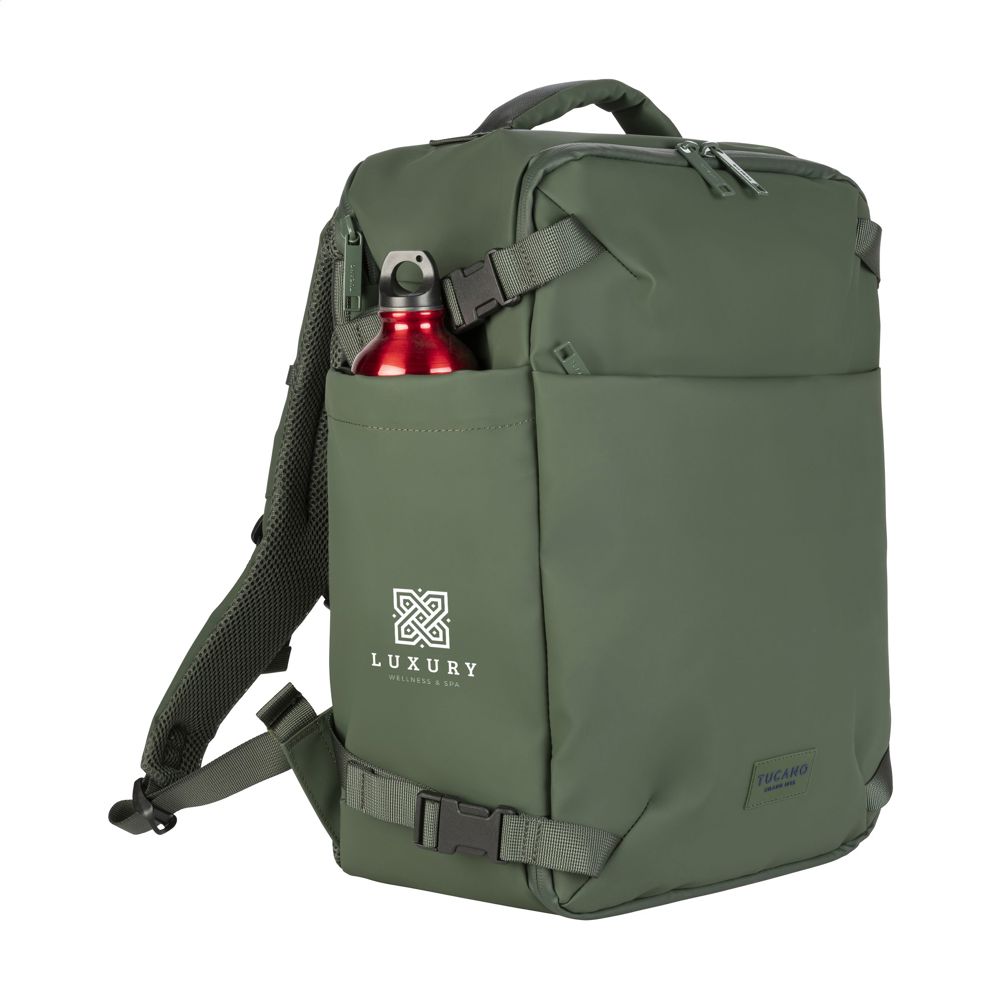 Handbagage rugzak van het Italiaanse merk Tucano. Deze rugzak voldoet aan de afmetingseisen van alle lowcost luchtvaartmaatschappijen. Gemaakt van regenbestendig, met hars gecoat materiaal dat is geproduceerd uit gerecycled kunststof, waaronder 23 gerecyclede PET-flessen. Ook de ritsen zijn bestand tegen de regen. Deze reisvriendelijke cabin-rugzak heeft een ruim binnenvak voor kleding en accessoires, een groot ritsvak aan de voorzijde en een zijvak voor een paraplu of waterfles. Met een gewatteerd vak aan de achterzijde voor het vervoeren van laptops tot 15,6 inch of een MacBook Pro 16 inch. Aan de achterkant zit een verborgen ritsvak voor het opbergen van persoonlijke documenten. De tas is volledig gevoerd. Dankzij de gewatteerde schouderbanden en de twee handgrepen, één aan de bovenkant en één aan de zijkant, is deze tas altijd gemakkelijk te dragen. Deze rugzak is ontworpen om te voldoen aan de cabineafmetingen van alle luchtvaartmaatschappijen. Past onder de stoel in het vliegtuig en is daarmee de ideale reisgenoot tijdens vliegreizen.