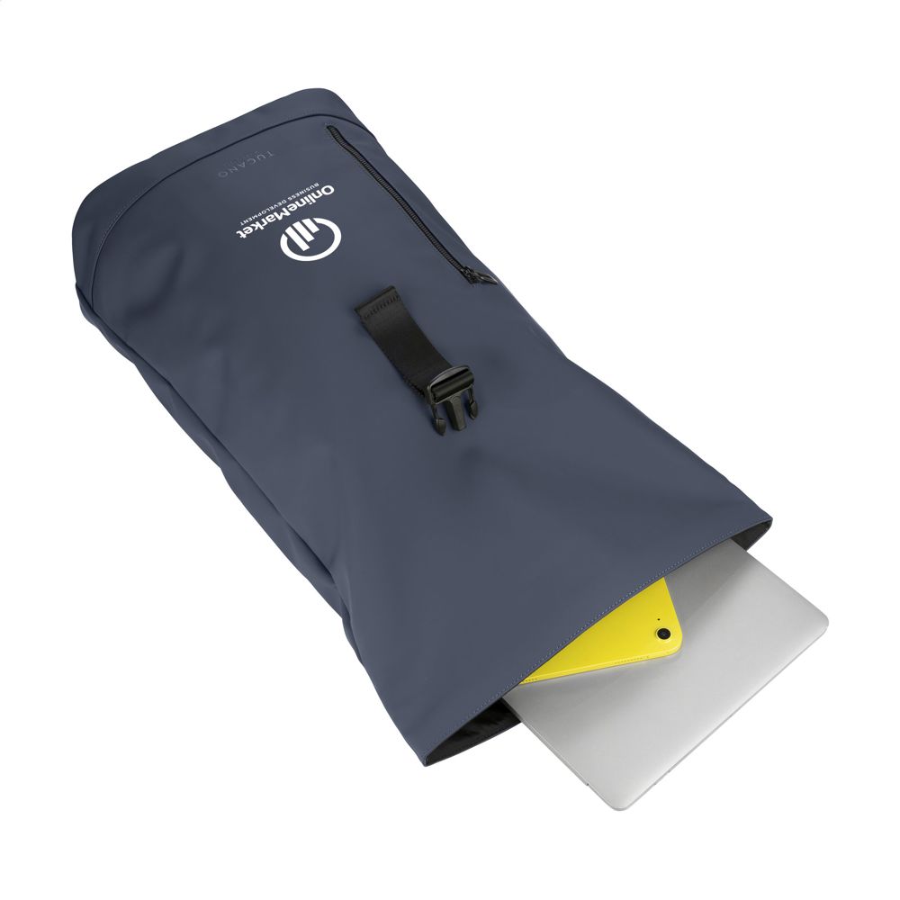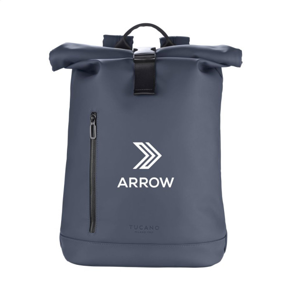 Sportieve 'roll-top' rugzak, met stevige kunststof sluiting, van het Italiaanse merk Tucano. Gemaakt van rubberachtige materialen geproduceerd uit gerecycled kunststof, waaronder 22 gerecyclede PET-flessen. Het waterbestendige materiaal aan de buitenzijde is verrassend soepel en geeft de tas een strakke en moderne look. Voorzien van een groot enkel compartiment met een intern, stootbestendig laptopvak (tot 15,6 inch of MacBook Pro 16 inch) met een mesh insteekvak en een ruim ritsvak aan de voorzijde voor essentiële accessoires. Compleet gevoerd. De verstelbare, gewatteerde schouderbanden en de ademende mesh rugzijde zorgen voor extra draagcomfort. Met trolleyriem en draaglus. Vrij van PVC. Een ideale rugzak voor dagelijks gebruik. Inhoud ca. 22,5 liter.