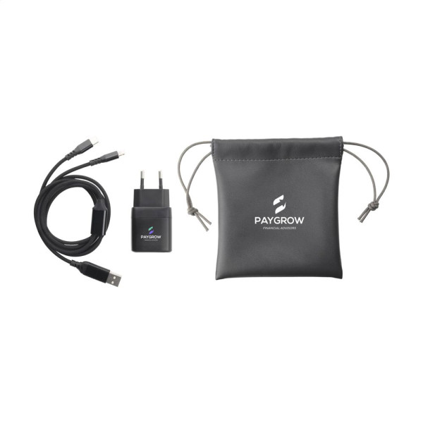 Oplaadset: Wandoplader van gerecycled PC. Met 2 Type-C poorten en een oplaadkabel. De kabel is gemaakt van gerecycled TPE, gerecycled PET en gerecycled aluminium alloy. Lengte kabel 120 cm. Ingang: Type-C en USB-A-connector. Uitgang: Type-C en Lightning. Per set in pouch van gerecycled PU. Ideaal als reisset. RCS-gecertificeerd. Totaal gerecycled materiaal: 45%. Per stuk verpakt.