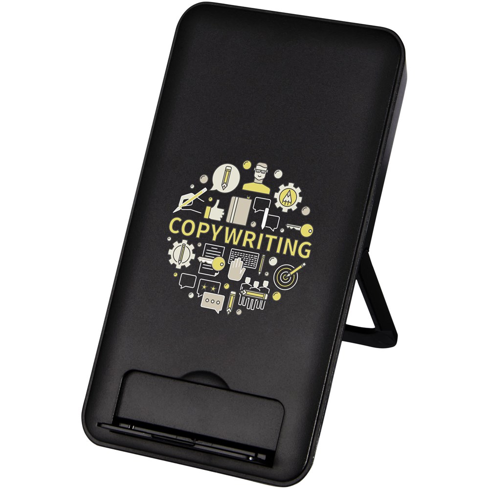 Draadloos oplaadstation gemaakt van gerecycled ABS plastic. Het oplaadstation dient ook als telefoonstandaard, waardoor dit het perfecte bureauaccessoire is. Sluit de oplaadpad aan op een computer of laptop en plaats het apparaat erop om het opladen te starten. Draadloze output is 10 W (max) voor snel opladen. Compatibel met alle Qi-apparaten (iPhone 8 of hoger en Android-apparaten die draadloos opladen ondersteunen). Geleverd in een geschenkverpakking inclusief handleiding (beide gemaakt van duurzaam materiaal).