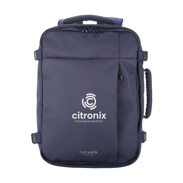 Handbagage rugzak van het Italiaanse merk Tucano. Deze rugzak voldoet aan de afmetingseisen van alle lowcost luchtvaartmaatschappijen. De rugzak is gemaakt van materialen geproduceerd uit gerecycled kunststof, waaronder 24 gerecyclede PET-flessen. Het hoofdvak is groot en ruim, ideaal voor kleding en accessoires. De ritssluiting is voorzien van afsluitbare ritstrekkers, zodat je het hoofdvak kunt afsluiten met elk hangslot (exclusief) dat hiervoor geschikt is. Bovendien beschikt de rugzak over een interne AirTag-houder. Het gewatteerde, stootbestendige achtervak is geschikt voor het vervoeren laptops tot 15,6 inch of MacBook Pro 16 inch. Compleet gevoerd. De verstelbare, gewatteerde schouderbanden en de gewatteerde rugzijde zorgen voor extra draagcomfort. Met handige trolleyriem en extra ritsvak aan de achterzijde, ideaal voor het opbergen van persoonlijke documenten. Geniet van perfecte draagbaarheid met twee handgrepen, één aan de bovenkant en één aan de zijkant. Deze rugzak is ontworpen om te voldoen aan de cabineafmetingen van alle luchtvaartmaatschappijen. Past onder de stoel in het vliegtuig en is daarmee de ideale reisgenoot tijdens vliegreizen. Inhoud ca. 23 liter.