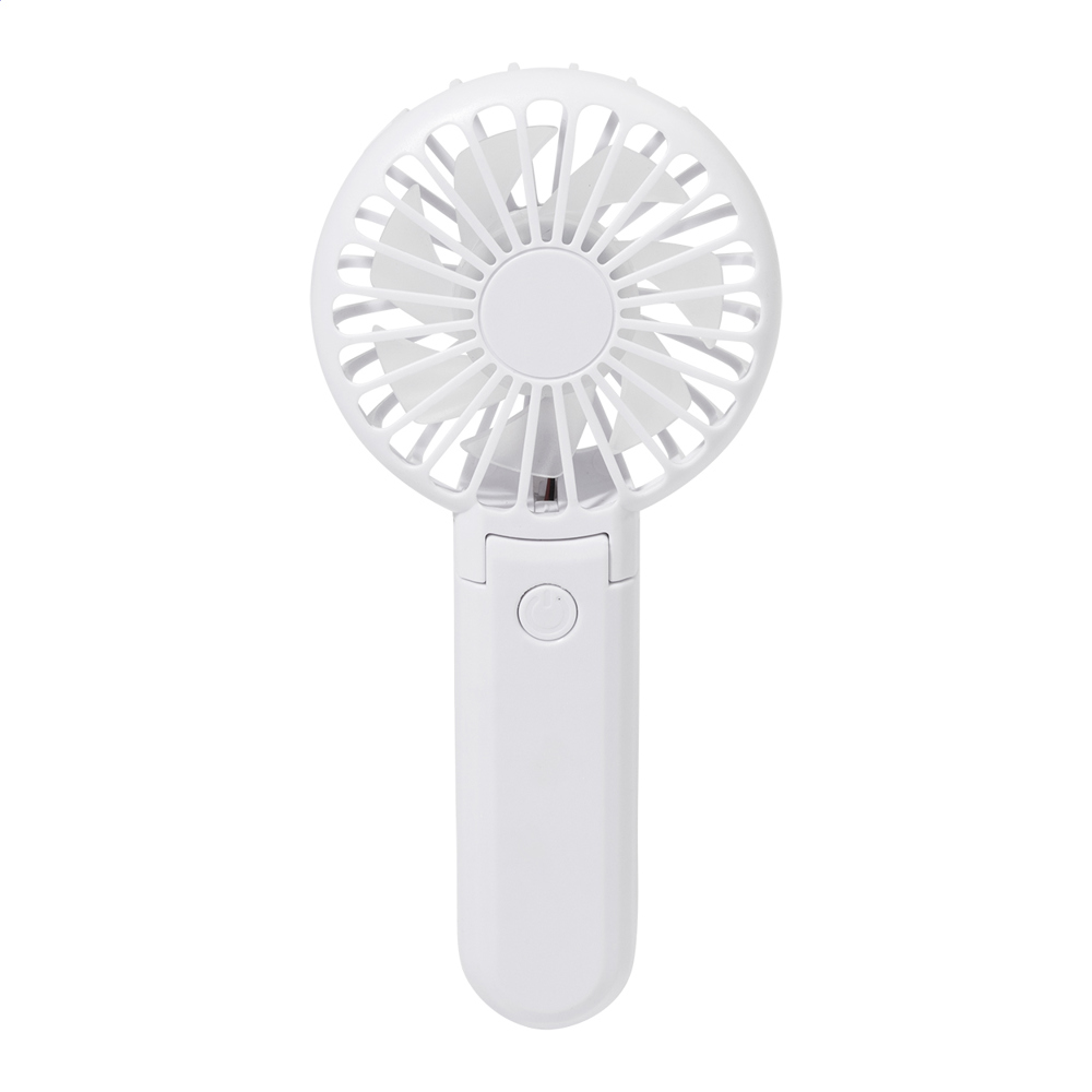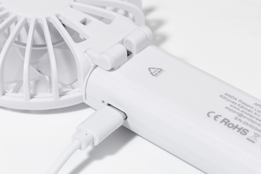 Gerecycleerde ABS elektrische handventilator met ingebouwde USB oplaadbare batterij (400 mAh). Met instelbare hoofdhoek en 3 snelheidsinstellingen. Inclusief USB lader kabel.