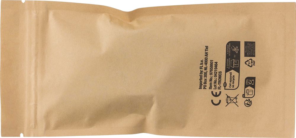 ABS uitschuifbare oplaadkabel met bamboe details. Met USB-C, lightning en USB-A. Individueel verpakt in een bruine kartonnen zak.