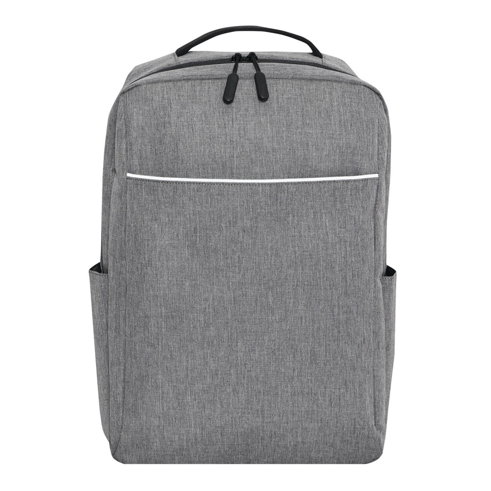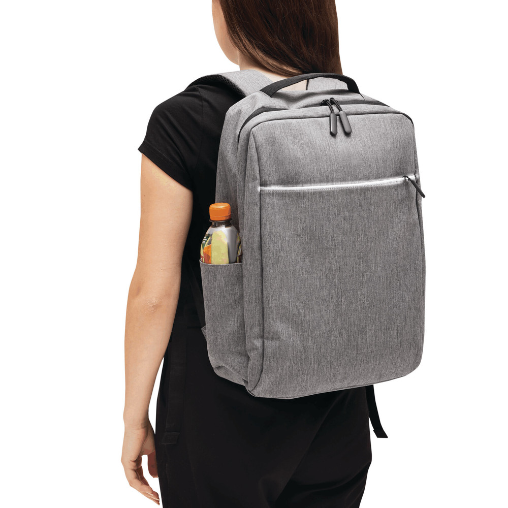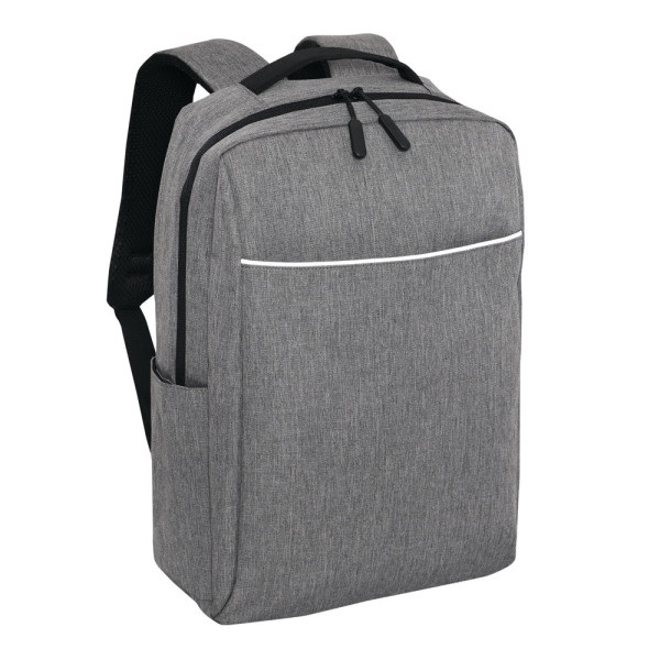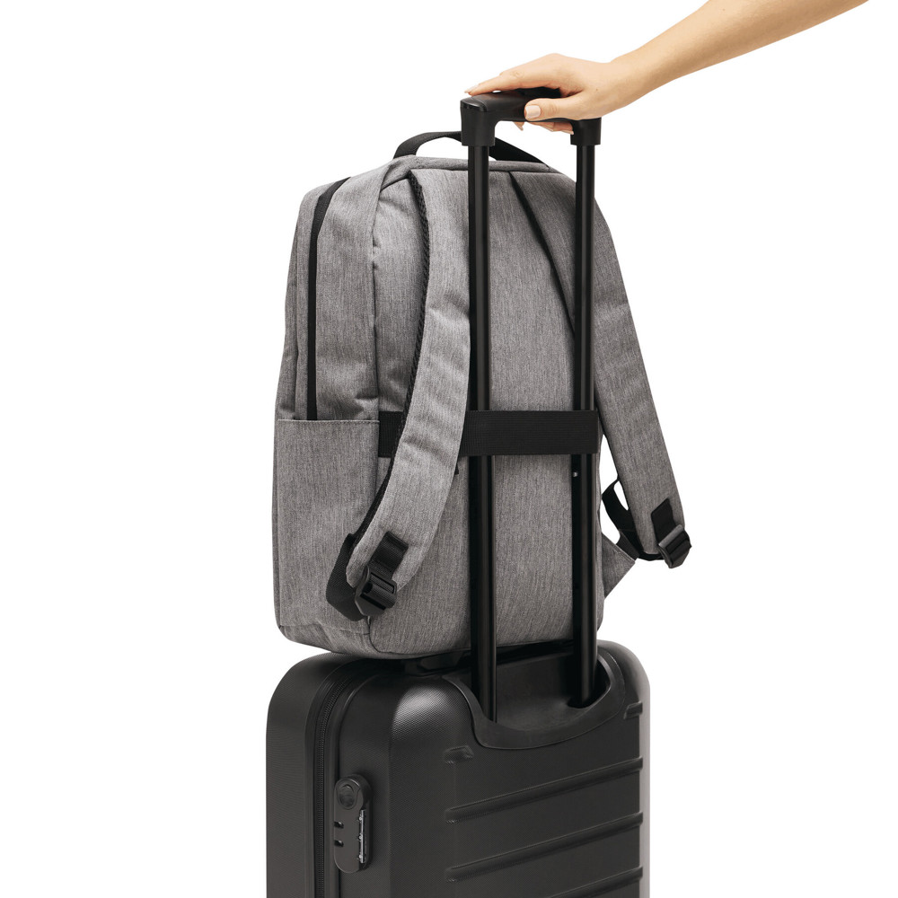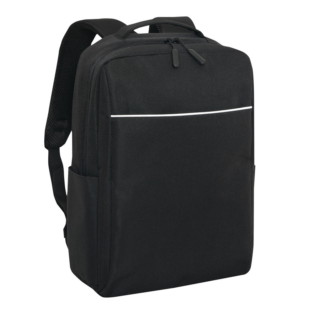 Rugzak GHENT: van gerecycled polyester (RPET), voorvak met ritssluiting en reflecterende strepen, hoofdvak met ritssluiting en gewatteerd binnenvak voor laptop of tablet, organizer met 4 insteekvakken, 2 zijvakken, gewatteerde draaggreep, gewatteerde en verstelbare schouderbanden, band op de achterkant voor bevestiging aan een trolley of als reporterdraagfunctie.