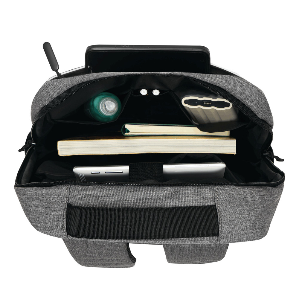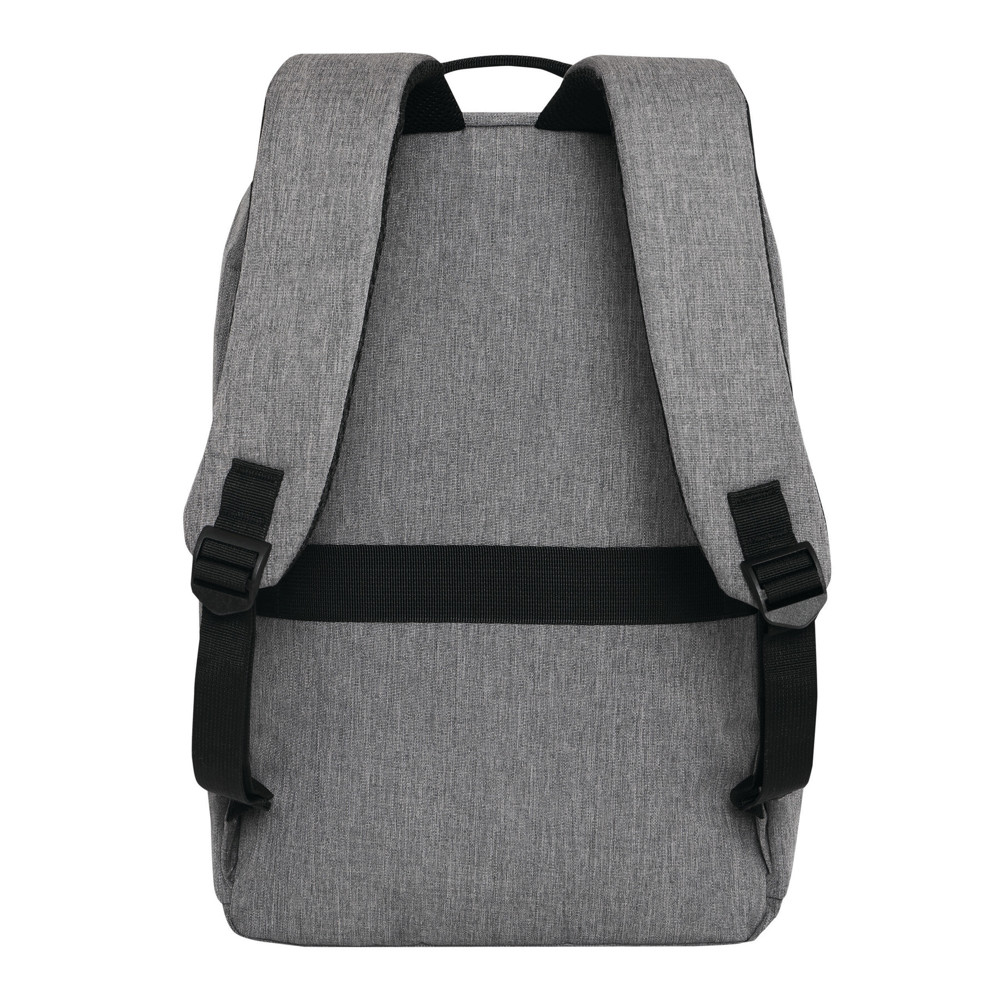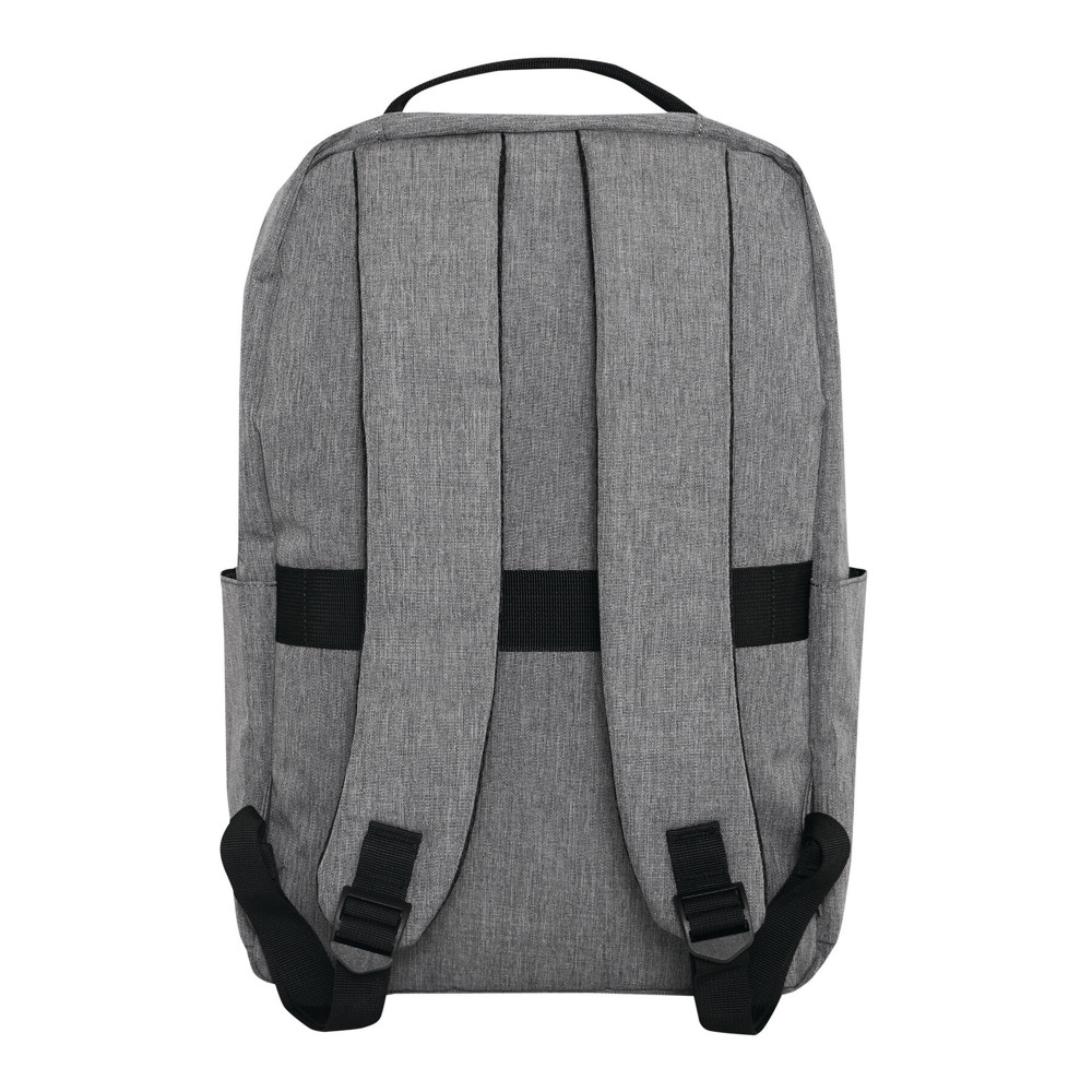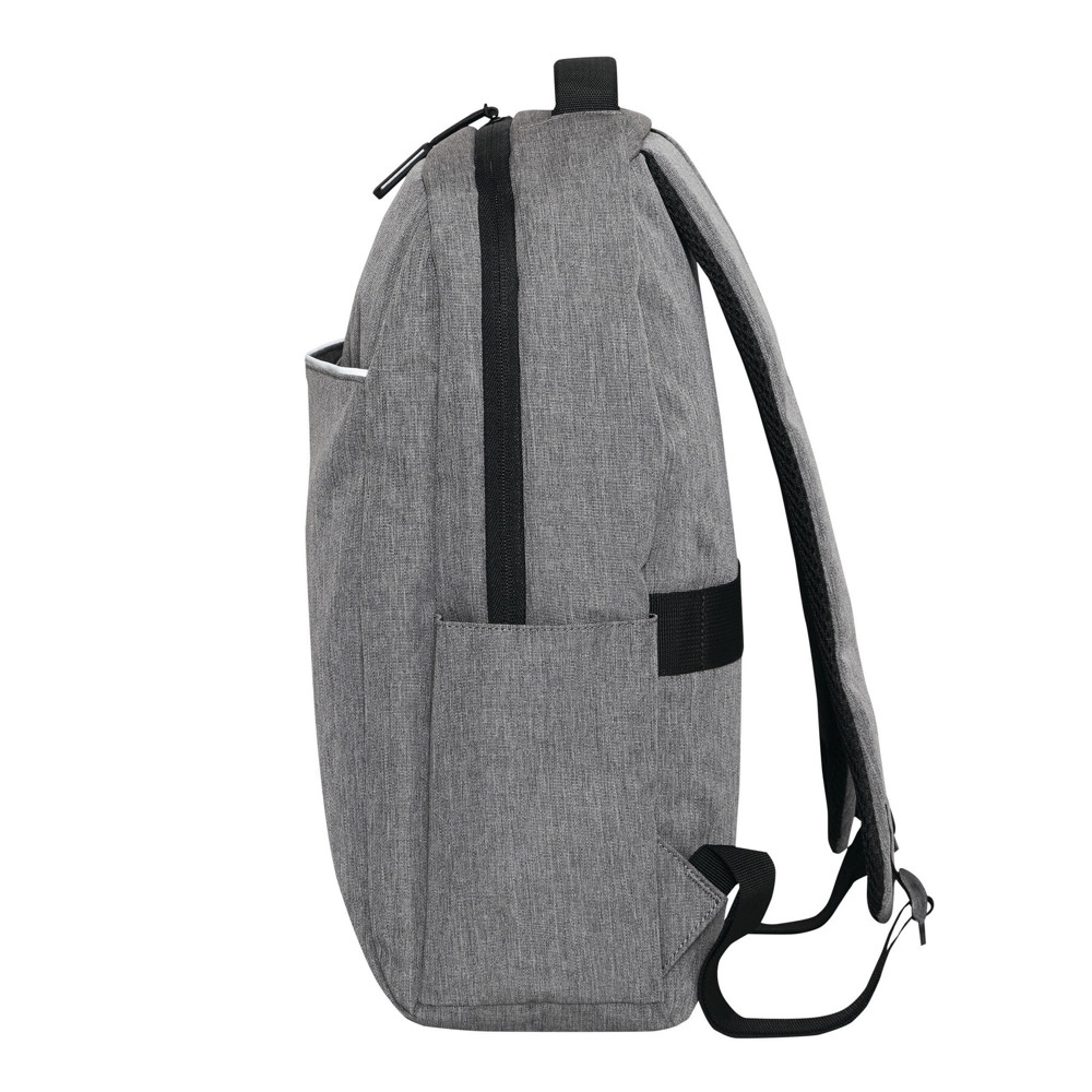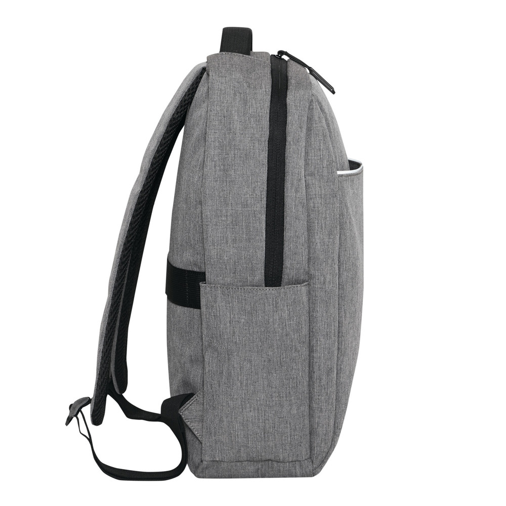 Rugzak GHENT: van gerecycled polyester (RPET), voorvak met ritssluiting en reflecterende strepen, hoofdvak met ritssluiting en gewatteerd binnenvak voor laptop of tablet, organizer met 4 insteekvakken, 2 zijvakken, gewatteerde draaggreep, gewatteerde en verstelbare schouderbanden, band op de achterkant voor bevestiging aan een trolley of als reporterdraagfunctie.