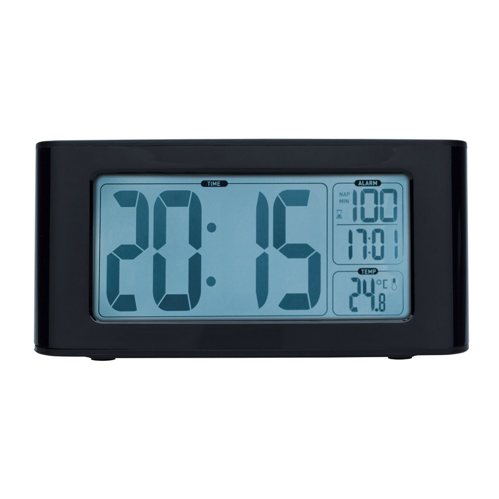 kunststof, zwart, alarmgeluid, Batterij: inbegrepen, Klok, LCD display, Licht, Thermometer, Tijdweergave: 12, Tijdweergave: 24, Wekker met snooze