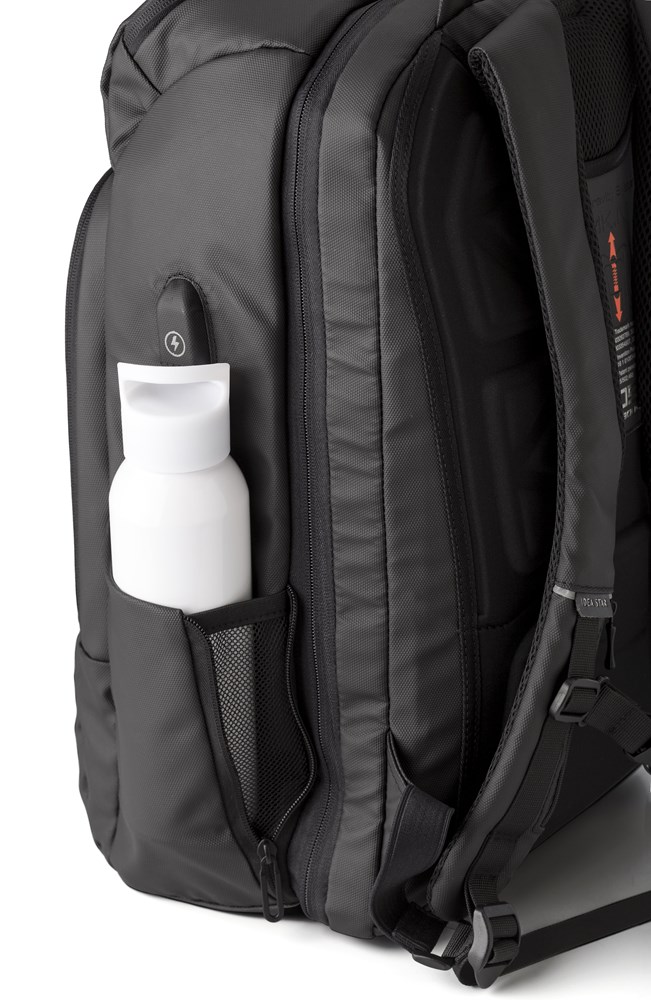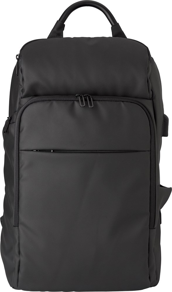 PU (600D) rugzak met vakken aan de voorkant en zijkanten en een laptopvak (15 inch) aan de binnenzijde. Gewatteerde rug en schouderbanden, die ook verstelbaar zijn. Speciaal systeem om belasting op de rug te verminderen. Inclusief USB poort en kabel.