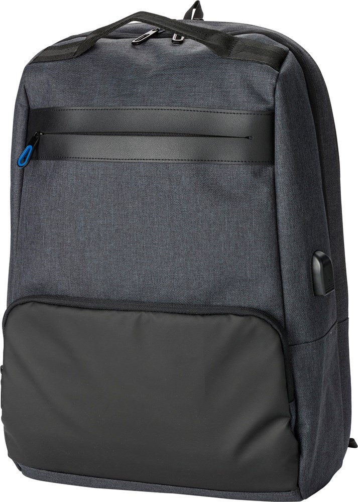 PVC rugtas met twee compartimenten, één geschikt voor een laptop (15 inch). De rugtas heeft een antidiefstal vak aan de achterzijde en aan de voorkant twee ritsvakken. De verstelbare schouderbanden zijn gewatteerd.