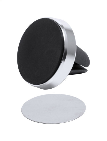 Aluminium magnetische mobielhouder om aan het luchtrooster te bevestigen. Incl. zelfklevende metalen plaat. Geleverd in geschenkverpakking.